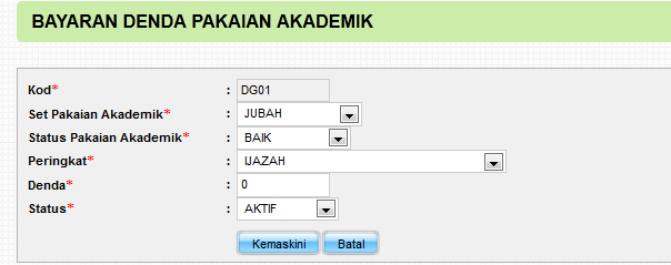- Skrin memaparkan Skrin kemaskini bayaran denda pakaian akademik