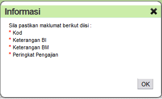 - Jika Pengguna tidak memasukkan maklumat pada medan yang bertanda * , mesej informasi dipaparkan kepada pengguna
