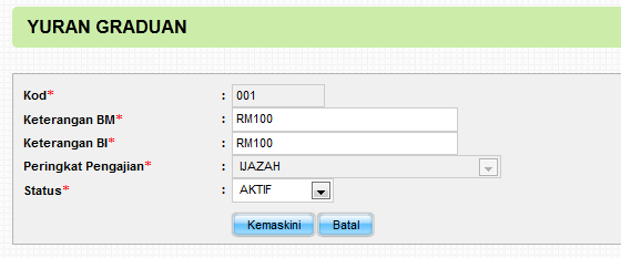 Skrin 22 : Antaramuka untuk kemaskini Yuran Graduan